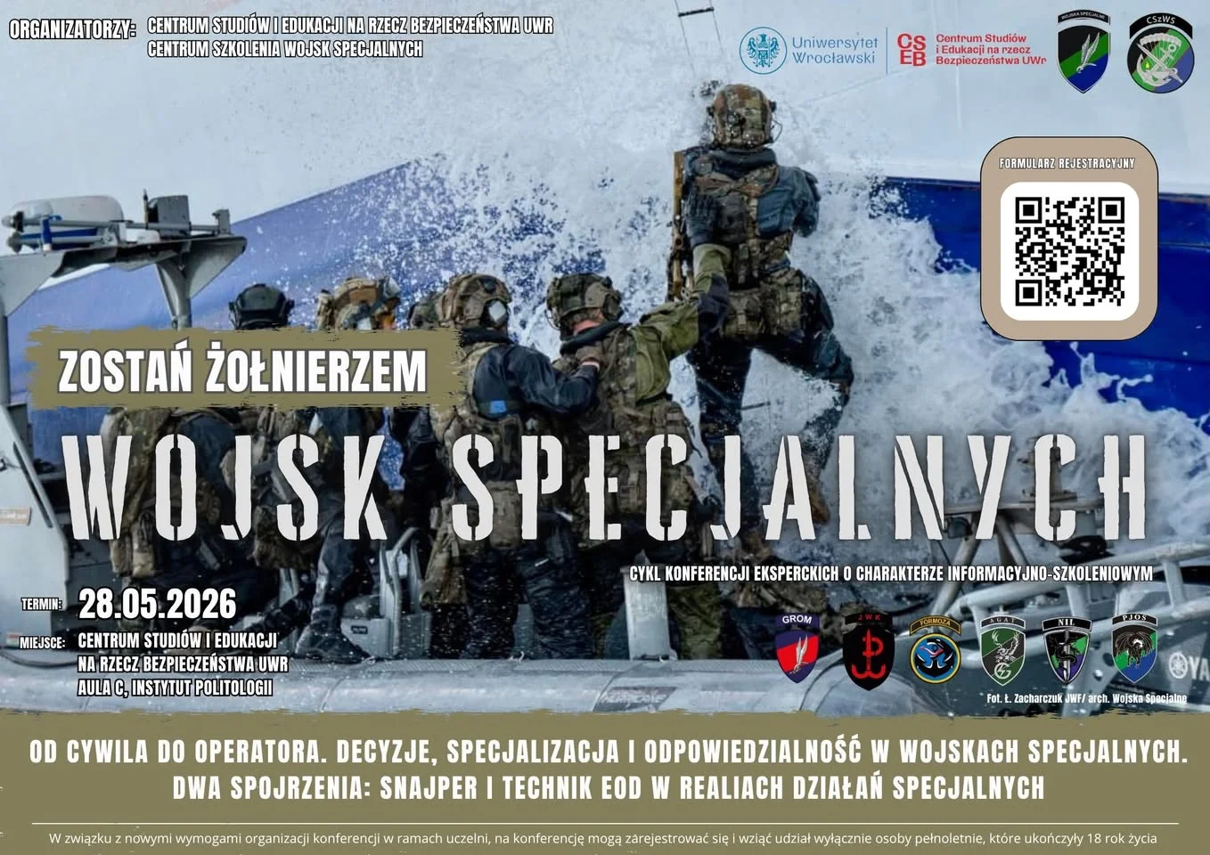 I KONFERENCJA EKSPERCKA 16.05. 2023 WOJSKA SPECJALNE – SPECYFIKA JWS, KWALIFIKACJE, USTAWA O OBRONIE OJCZYZNY – PROJEKT – ZOSTAŃ ŻOŁNIERZEM WOJSK SPECJALNYCH – 16.05 2023 Centrum Studiów i Edukacji na rzecz Bezpieczeństwa UWr & Centrum Szkolenia Wojsk Specjalnychw kooperacji z Centralne Wojskowe Centrum Rekrutacji uruchamia nowy projekt cyklu KONFERENCJI EKSPERCKICH o charakterze INFORMACYJNO-SZKOLENIOWYM WOJSKA SPECJALNE – SPECYFIKA JWS, […]
